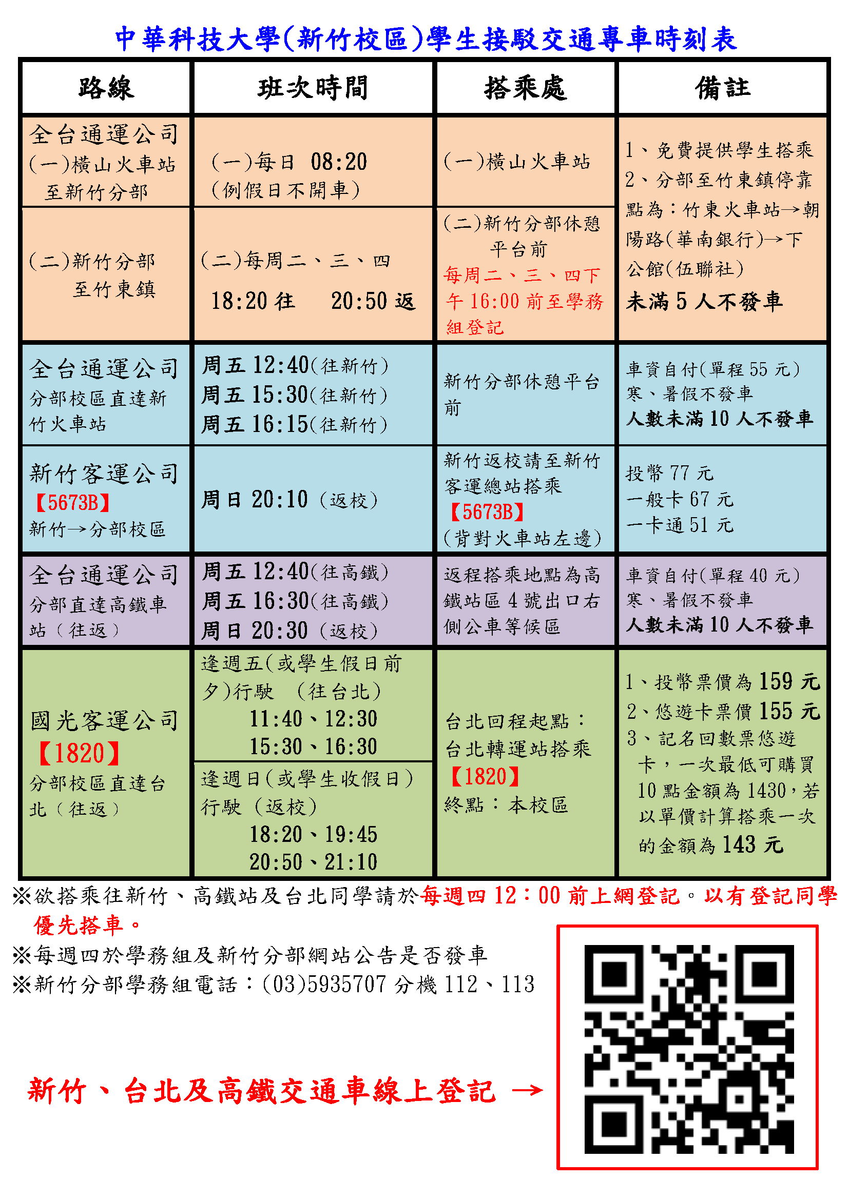 A:可步行至台三線搭新竹客運至下公館站,出站後向左方前進約300公尺即可到達國光客運站搭車前往台北。學生假日返家亦可搭乘學校安排的交通車至台北火車站(往返)。